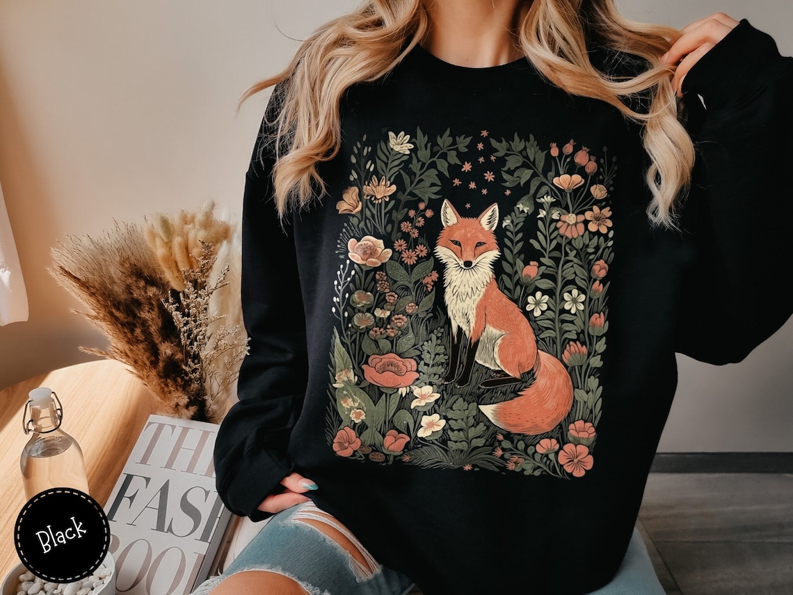 Vintage Fox in Wildflower Meadow Sweatshirt, Cozy Cottagecore Folklore Sweater, Floral Animal Shirt, Fairycore Pullover, Forestcore Sweater
